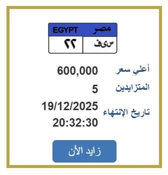 أعلنت بوابة مرور مصر الإلكترونية، المزايدة على لوحة معدنية مميزة للسيارات، وصل سعرها إلى 600 ألف جنيه، وتحمل رقم «س ي ف 22»، ويتزايد عليها حتى الآن 5 أشخاص، ومن المقرر أن تنتهي المزايدة عليها اليوم الجمعة الموافق 19 ديسمبر 2025.