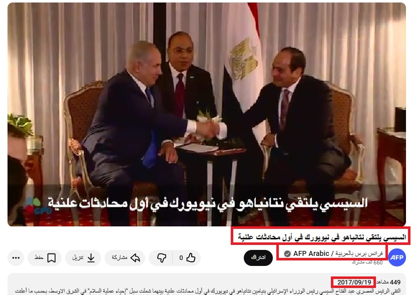 وقد نشرته وكالة "فرانس برس" في حسابها في ">يوتيوب في التاريخ ذاته، بعنوان: "السيسي يلتقي نتنياهو في نيويورك في أول محادثات علنية".