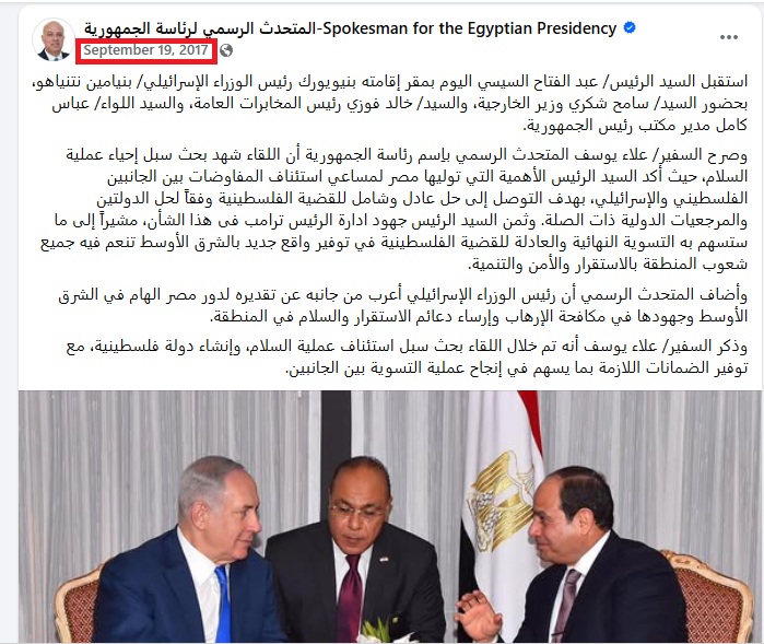 وبحسب البيان الصادر عن رئاسة الجمهورية المصرية يومذاك، استقبل السيسي نتنياهو في مقر إقامته بنيويورك.