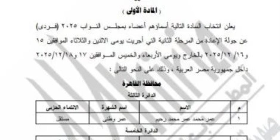 الجريدة الرسمية تنشر نتائج جولة الإعادة بالمرحلة الثانية بانتخابات النواب - وضوح نيوز, اليوم الأحد 28 ديسمبر 2025 11:30 صباحاً