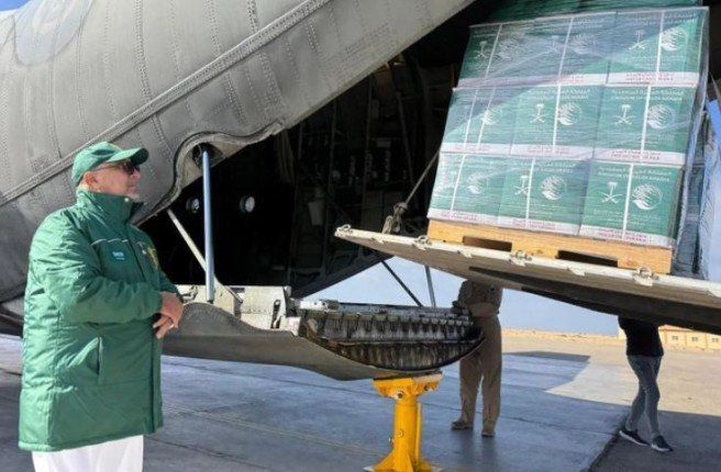 حيث تحمل الطائرة السعودية الـ(77) على متنها سلالًا غذائية وحقائب إيوائية، تمهيدًا لنقلها إلى المتضررين من الشعب الفلسطيني الشقيق داخل قطاع غزة.