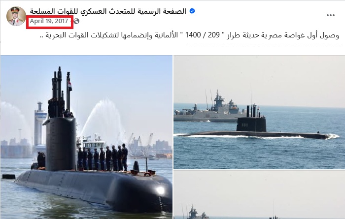 فقد نشرت الصفحة الرسمية للمتحدث العسكري المصري في الفايسبوك هذه الصور، بتاريخ 19 نيسان/أبريل 2017، بعنوان: "وصول أول غواصة مصرية حديثة طراز 209 / 1400 الألمانية، وانضمامها لتشكيلات القوات البحرية".